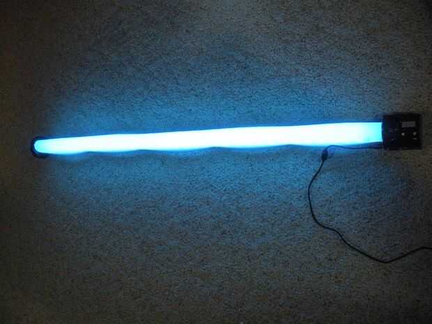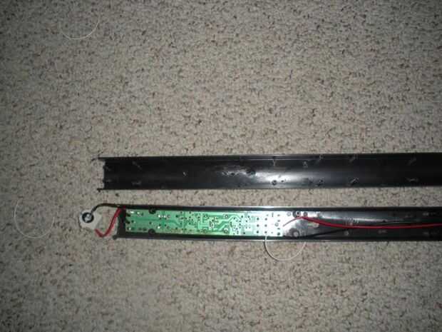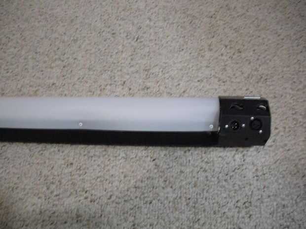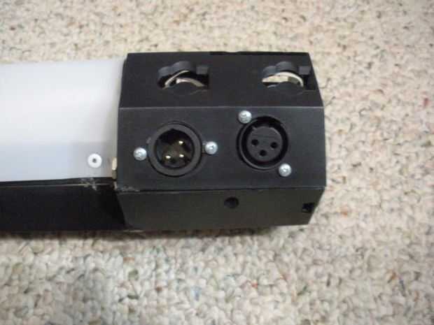 Usé un viejo artefacto fluorescente luz negra y reinstalado con 21 vatios 12v RGB LED franja de luz(6 vatios por el metro) y este controlador para ejecutarlo. Quería cierta versatilidad con cómo las conexiones se encontraban, así podría establecer en lado o soporte habría acceso al DMX de entrada/salida y botones de la pantalla. Tiene 2 juegos de DMX en y salidas a cada lado, están todos en paralelo, nada especial.