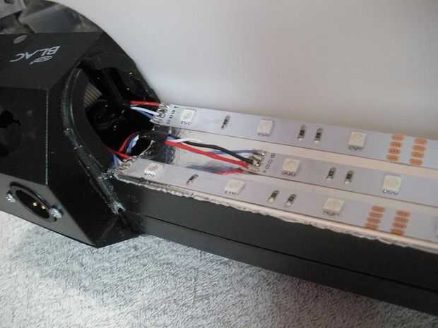 -Aplicar la tira de luz LED 12v RGB, yo hice 3 filas, con el 2 en el exterior más de la fila interna, con el desplazamiento de fila interna. Todos los extremos del cable están en el extremo con el controlador.