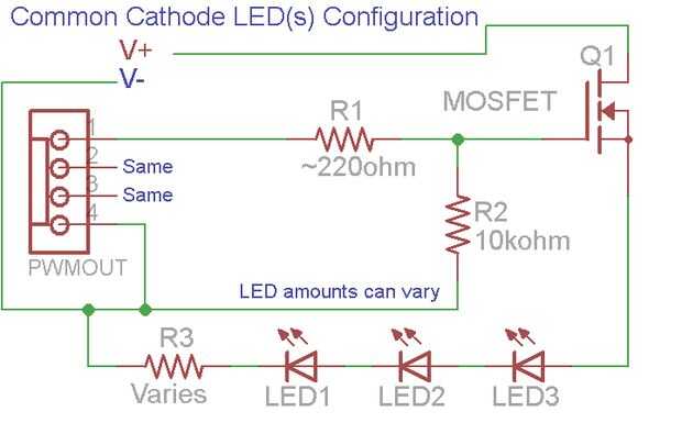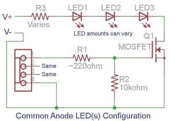 Se muestra aquí, es el común ánodo discreto salida/Breakout. Utiliza 3 x nivel de lógica MOSFET para controlar los colores. Esta junta no límite actual, cualquier limitación tendrá que hacer otro donde, por una línea de resistencia con el LED de cableado o usando módulos pre-ensamblados o tiras que tienen sus propias resistencias. El tablero es pequeño, 1,5 "x 1,5" x 0.5" alto. Bajo costo y debe ser capaz de manejar hasta 30w por canal o de LEDs. Los rastros de la parte inferior deben estar estañados si utiliza más de 20 watts total.