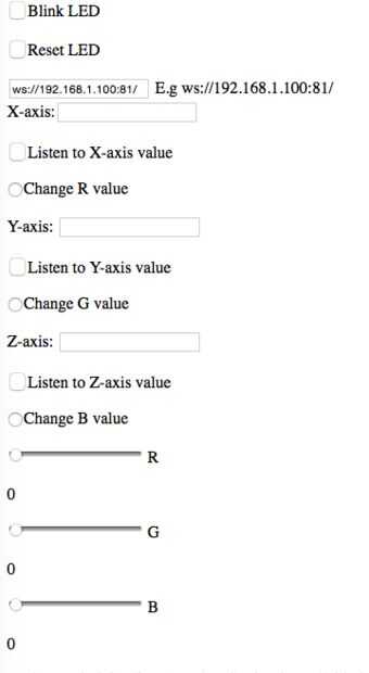 Hay 3 deslizadores, cada uno con valor mínimo 0 y máximo 255. Cada control deslizante R, G, B envía respectivamente los valores x, y, z que es recibido por el servidor de la web de esp y se convierte por consiguiente valor de LED rojo, verde o azul.
