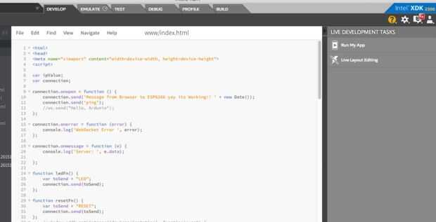 Escribí este simple archivo HTML en el IDE de XDK de Intel. Es similar a diferencia del teléfono, donde usted puede diseñar aplicaciones usando HTML5/Javascript para hacer aplicaciones de híbrido en la mayoría de las plataformas de smartphone. Sin embargo aquí no construyo una aplicación independiente. Obtener más información sobre XDK aquí. También hay un sabor de las cosas?, para aquellos que deseen utilizar Node.JS etc..