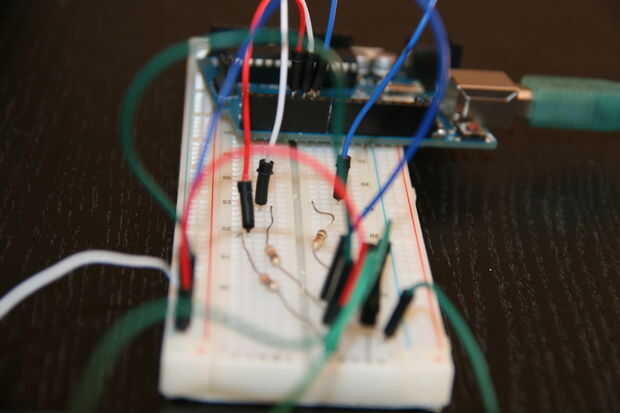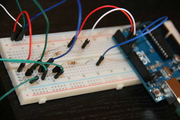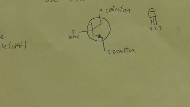 Un transistor es un pin 3 poco chico, el pin medio generalmente es donde va a "dar la orden" con Arduino (poner la resistencia allí). El colector es donde vas para poner su tierra procedente de la fuente de alimentación, te enchufas el LED emisor.