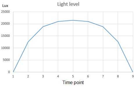 El nivel de luz en la superficie fue 15800 lux, por lo que la exposición luminosa es aproximadamente lux.h 158000 diariamente.