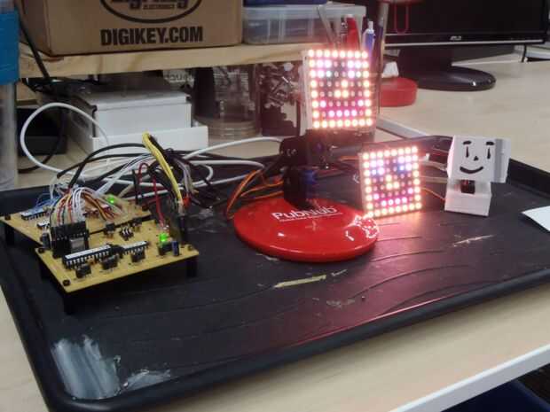 Hablar le de láseres con LEDs, y finalmente se asentaron sobre el uso de matrices de LED RGB. Inicialmente intentó utilizar Rainbowduino para conducir una sola matriz de LED, pero no tan bien funcionaba hacia fuera. Me ofrecí a diseñar y construir un tablero de controlador personalizado que no sólo podría conducir a una matriz, sino dos, usando una sola ATmega328p - chip de la misma en la Junta de Rainbowduino.