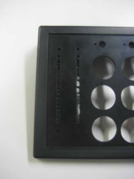Una segunda impresión en el esquema del gancho agarrador y pegarlo a la tapa de la caja. Con una broca de 3mm, perfore los orificios para los potenciómetros deslizantes. Ahora viene la parte tediosa/diversión. Para hacer el surco, una serie de agujeros todo el camino abajo la longitud de la ranura del taladro. Los orificios deben estar separados por no más de 1-2mm. Tómese su tiempo y tratar de mantener los agujeros lo más recto posible.