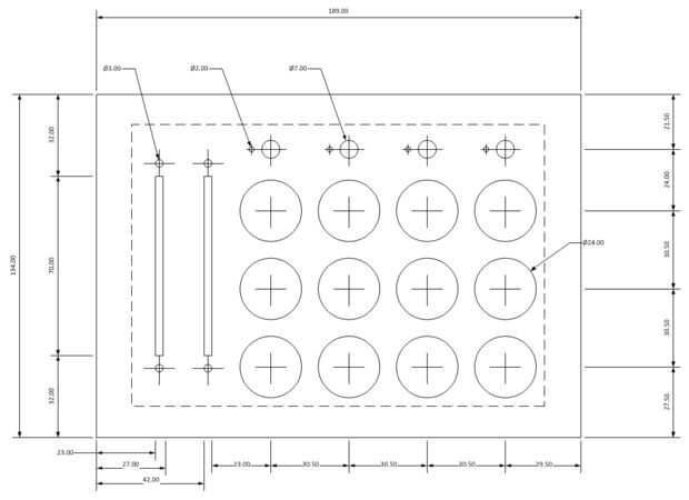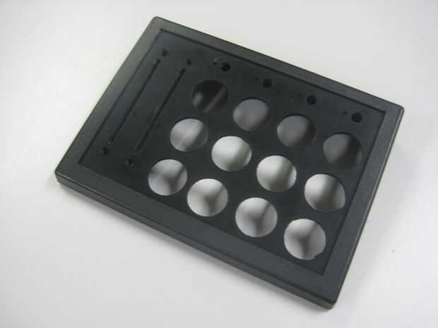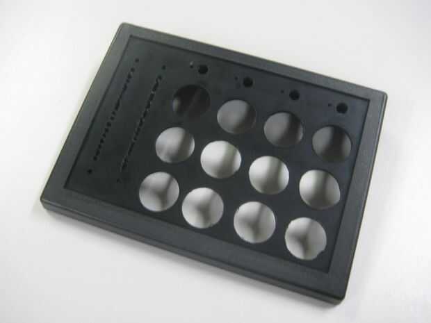 Basado en el esquema existen tres tipos de agujeros a realizar; un agujero pequeño de 7mm para los potenciómetros rotativos, un agujero de 24mm más grande para los botones de arcade y una ranura larga y estrecha para los potenciómetros deslizantes. También necesitaremos otro pequeño agujero en la parte posterior de la caja para conectar el cable USB a la placa Arduino y obviamente los agujeros de tornillo.
