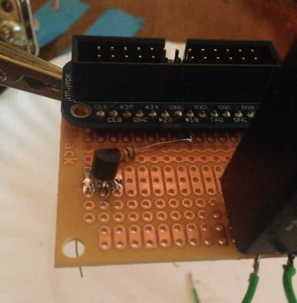 4. soldar un extremo de la resistencia a la pata del medio del transistor (pin base) y el otro extremo al pin GPIO 18.