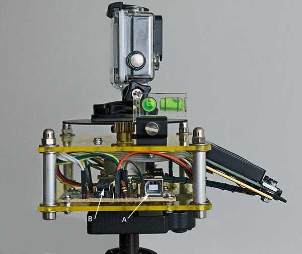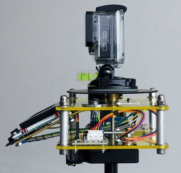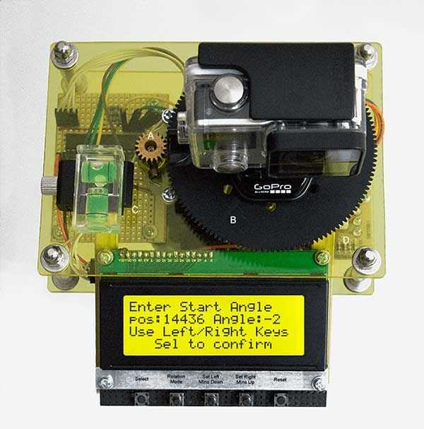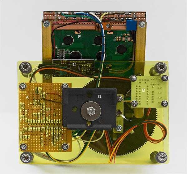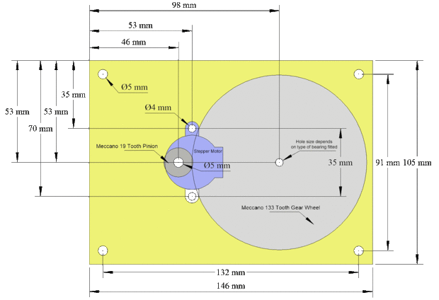La rueda de engranaje y motor paso a paso se montan entre 2 hojas de plexiglás separadas por 4 x M4 x50mm (2") tornillos hexagonal y 4 tubos de aluminio para actuar como espaciadores. Disponen de rodamientos con bridas 4mm superior e inferior de 3mm en los agujeros en la hoja. Una vez que el motor paso a paso y los engranajes fueron montados los tableros de control se ajustaron entonces alrededor de estas piezas.