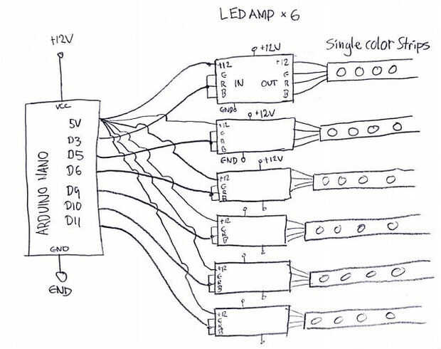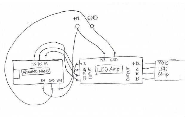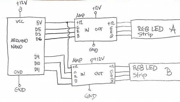 Los circuitos conectan 5v de Arduino a 12v en la entrada de amperios del LED (ánodo común). Esto puede parecer extraño. Voy a intentar hacer algún sentido de la misma. La R, B, entradas de G de la amp se unen a la salida digital del Arduino. Un alfiler 0 crea un 5v potencial de ánodo común que dará como resultado en un 12v potenciales en la salida correspondiente se iluminará el LED. En otras palabras, un digital 0 se enciende la luz. Digital 1 lo desactiva. O, al usar ciclos de trabajo PWM, 255 es apagado y 0 es el.