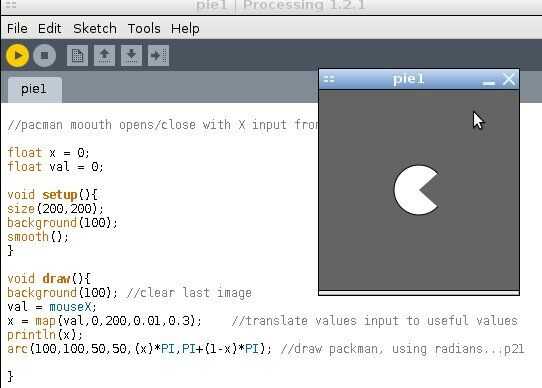Arc(100,100,50,50,(x)*PI,PI+(1-x)*PI); dibujar packman, usando radianes... p21