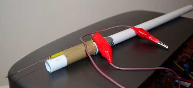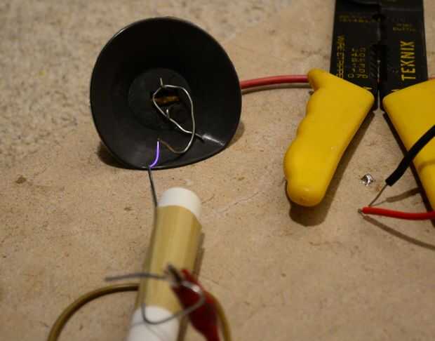 Seguro un electrodo de algún tipo en el extremo de él, afilados clavos punta funcionan bien y le dará arcos ligeramente más grandes que electrodos redondeados. Entonces puede colocar un alambre de algún tipo al electrodo de palo de pollo que el otro extremo se unirá con el conector de retorno de HV en el transformador flyback.