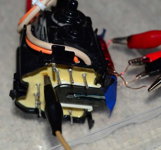 Llevar el palo de pollo cerca de los pernos de base en el flyback y pasar cada uno individualmente. Algunos de ellos pueden dar una chispa leve pero uno de ellos debe dar un sólido arco de alto voltaje constante, esta será su pin retorno de alto voltaje. Ahora debe desconectar su palo de pollo de la HV a y conecte con el conector de retorno de HV en lugar de otro.