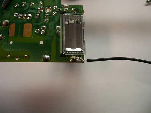 Para hacer este circuito más cómodo de usar, es el momento de añadir algunos cables. Aviso el condensador tiene una raya sobre ella. El cable negro se conectará al conductor debajo de la raya, y el cable rojo se conectará con el otro cable.