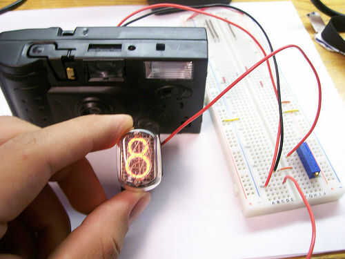 Ahora, conectar el circuito para el tubo de nixie. Poner el potenciómetro entre uno de los cables y el tubo de nixie y ajuste según sea necesario. Con mi tubos IN-12A, 200Kohms pasar unos.3 mA, que es suficiente para iluminar los tubos, pero no es muy brillante. Experimentar con sus propios tubos (use el multímetro aquí). Lo siento por no mostrar fotos del proceso de calibración, pero este circuito apagó mi multímetro cuando accidentalmente creé un corto circuito. Como he dicho, tenga cuidado.