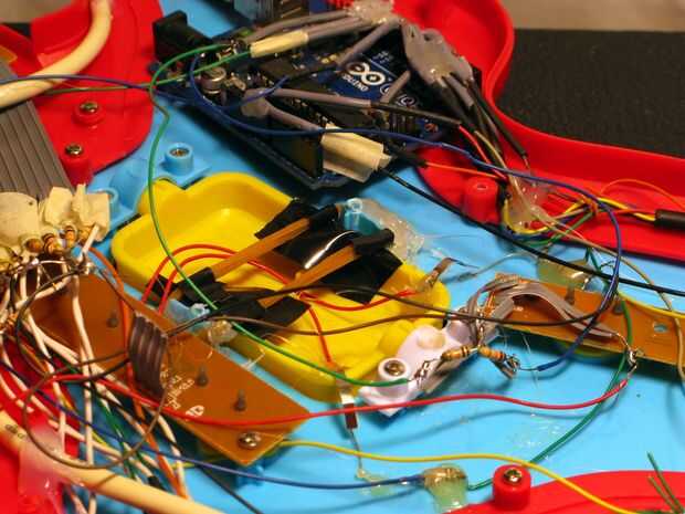 Después de realizar esta conexión lógica, tuve que hacer el rasgueo amarillo bar vuelve a la posición inicial, porque sin eso, sentir que empuja hacia abajo la barra de rasgueo (pero es la gravedad, no se). Mi primer pensamiento fue pegar una banda de caucho en la barra de rasgueo. Fue aceptable, pude rasgueo rápido, no había ninguna conexión inesperada, pero la goma se desgastaron y se rasgó después de unas horas (ya que fue frotado en el filo de plástico). En segundo lugar, pegué esas cosas de goma (que los botones se levante después de que empuja) debajo de la barra de rasgueo, pero fue peor que la banda de goma. Mi idea final era volver a las bandas de goma, pero pongo cinta eléctrica entre el caucho y los bordes afilados, por lo que no romper tan rápido como antes.