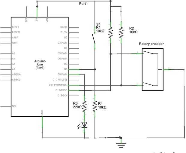 El esquema es muy simple. Pueden agregar más botones por replicar el circuito visto en el esquema. Montado el circuito un perfboard un instalado que en un pequeño recinto. Usé un cable de 9-base de datos para conectar el Arduino y el codificador incluido. En relación con el codificador el número de pasos por revolución no es crítico pero algo por encima de 10 hará bien.