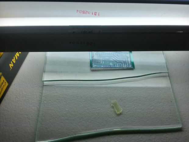 5. Coloque la placa de vidrio con el PCB bajo la lámpara fluorescente y gire inmediatamente en el tiempo y la lámpara... Gire la lámpara de como cuando llama tu teléfono.