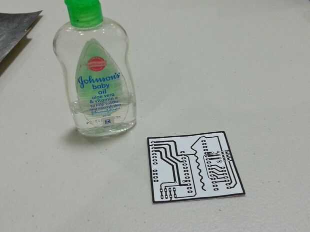 1 corte hacia fuera la disposición del PWB y aplique una pequeña cantidad de aceite de bebé y extender suavemente el líquido que rodea la paper.next Quite con cuidado cualquier aceite de bebé exceso limpiándolo con cualquier trapo