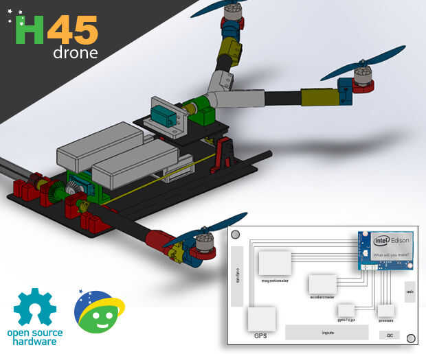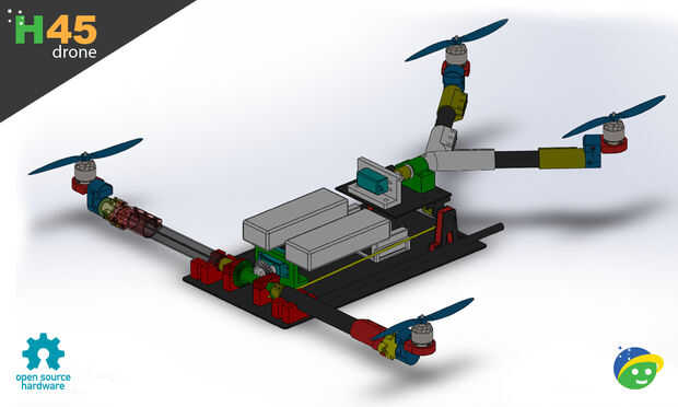 H45 es un Drone de Hardware abierto que está en desarrollo. El Drone constará de piezas en fibra de carbono y plástico ABS.