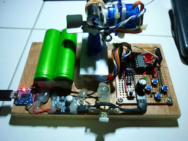 Este proyecto se inicia en un breadboard y un Arduino Uno como el microcontrolador. Una vez finalizada la codificación, el microcontrolador está conectado a un Atmel Attiny84A ejecutando el arduino-tiny core. Después de modificaciones para el Servo que controla parte del boceto del circuito se transfiere a un 5 x 7 cm perforado Junta. Con el circuito controlador principal completado la siguiente parte es la adición de la batería, la carga e impulsando el circuito. Todo el circuito se instala en la parte superior una 9x15x1.2cm madera laminada con tornillos y pegamento caliente.