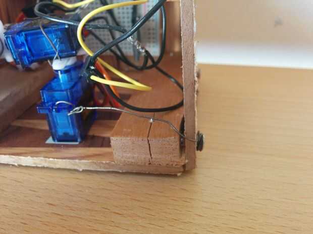 6. Utilice la cinta de doble cara para fijar los servos en la parte inferior de la caja y usar un alambre para fijarlo en su lugar.