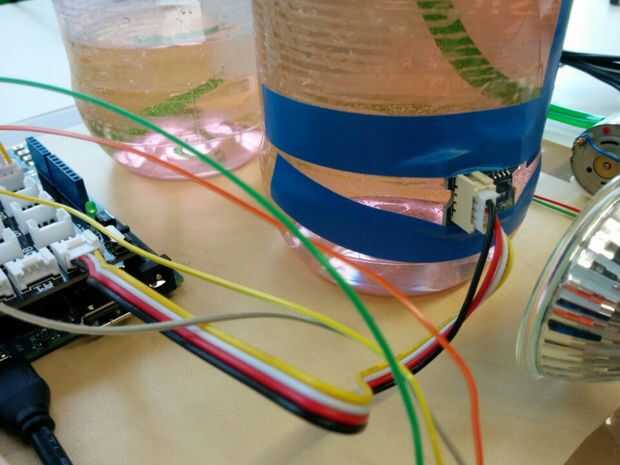 1. Conecte el kit de Sensor de temperatura de Grove para entrada analógica 0 y cinta adhesiva a la botella de plástico directamente en frente de la bombilla.