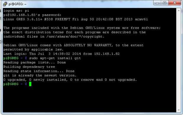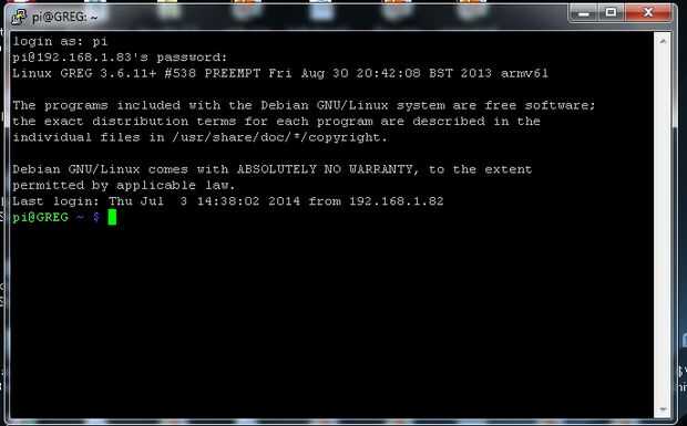 2. después haya establecido una conexión, Inicio de sesión con el nombre de usuario: 'pi' y la contraseña: 'frambuesa' (hacer esto si ya no has cambiado el nombre de usuario y contraseña)