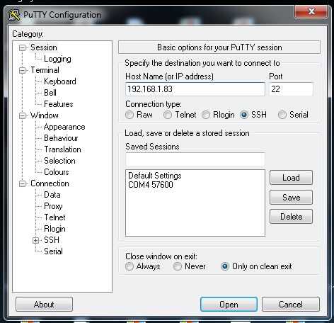 1. abre el Putty y conectar con el Pi R a través de SSH (se necesita es la dirección IP y conectarse a través del puerto 22)