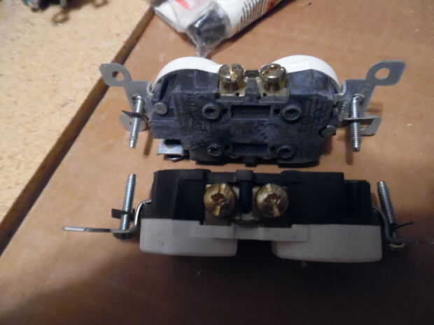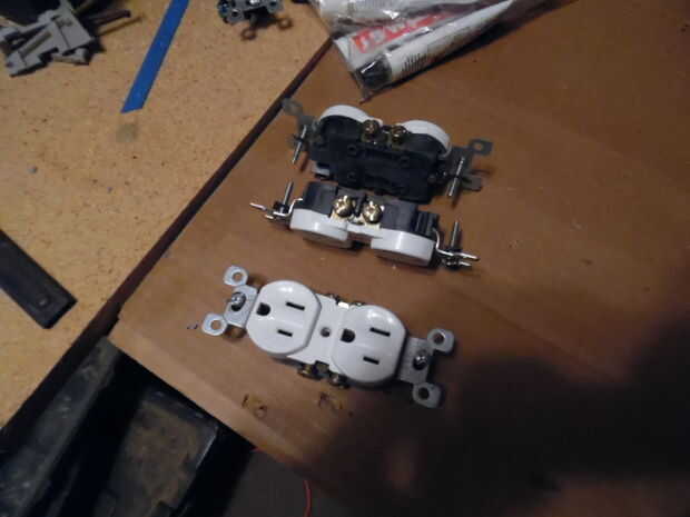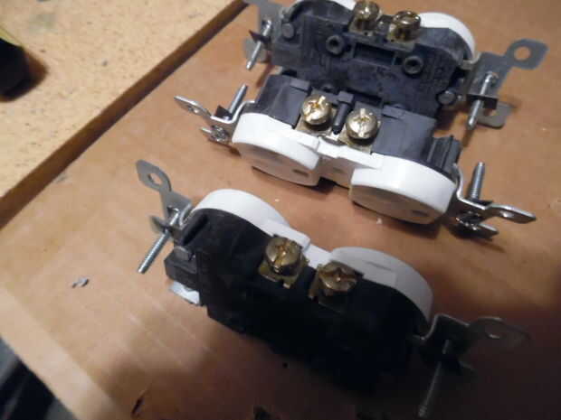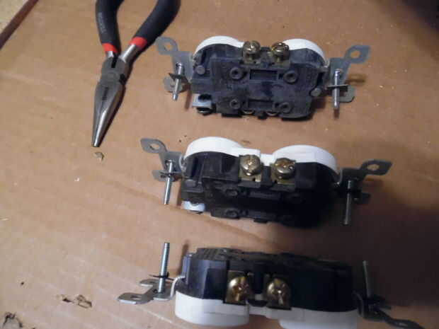 Mientras que el pegamento se está secando, dejarlo sentarse durante la noche. Recopilé las salidas y quité las lengüetas de conexión que conectan tanto el hots de las salidas y ambos los neutrales de las salidas. Estas fichas permiten sólo un cable conectar ambos puntos (un cable caliente al ambos lados calientes de las tomas, un cable neutro para ambos lados neutrales de las tomas), pero puesto que quería sólo una de estas salidas a ser controlado por un interruptor se me quitan las fichas para que cada toma se separarían eléctricamente. Si lo hice otra vez yo sólo quitaría las fichas en el lado caliente. Sería el lado neutro mucho más fácil de cableado.