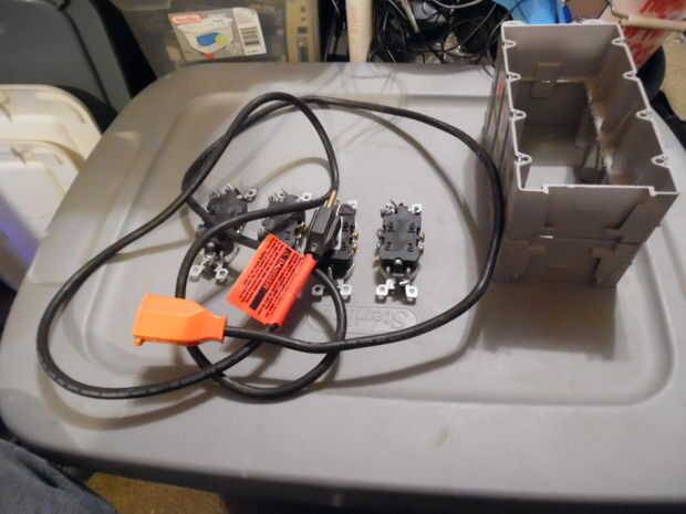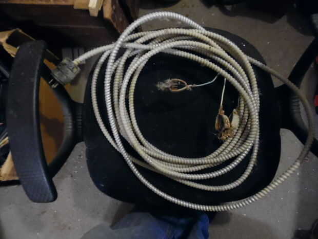 La imagen con el cable de alimentación con una chaqueta del metal (se muestra en una silla sin respaldo) es otra extensión que no he usado en muchos años. Note el uso peligroso de las pinzas en un extremo. No preguntes. todavía seriamente nada ilegal pero nada seguro cualquiera de los dos, no uno fue herido cuando fue utilizado, no utilice un cable como este. El cable este cable 3 cable aislado, cable sólido de calibre 16.