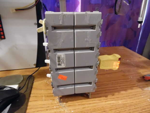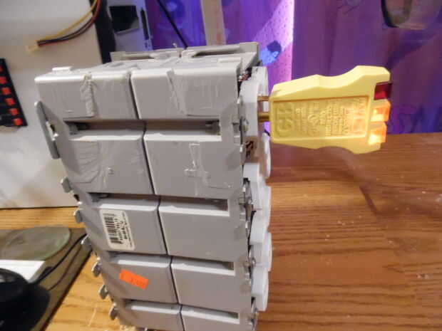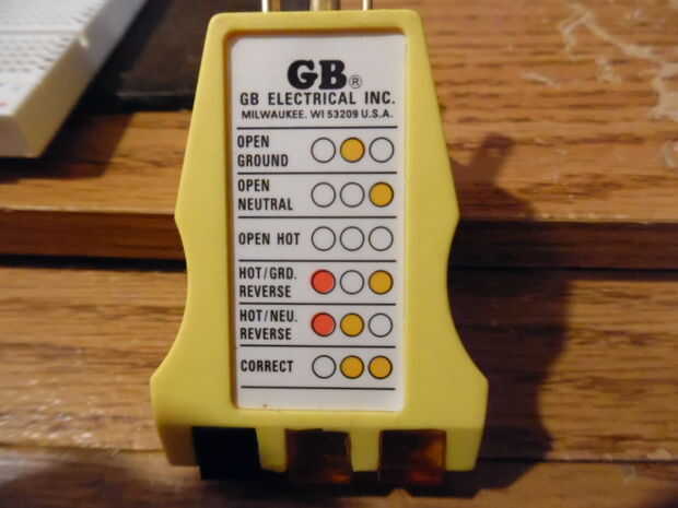 Con mi tester de polaridad de salida de 120 VAC, en mano enchufé el regulador de la energía AC. Los puntos de venta más cercanos a la cámara son las tomas pero todavía son controladas por el interruptor.