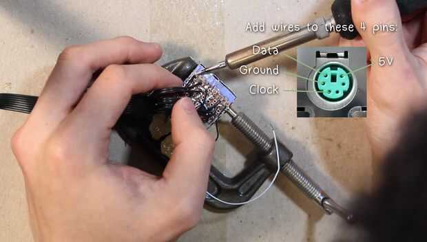 Los puertos PS/2 en lugar de la abrazadera y la soldadura de los cables a los cuatro pines de cada uno del puerto PS/2 que tenemos que acceder a (son los pines Vcc, tierra, reloj y datos - vea el diagrama).