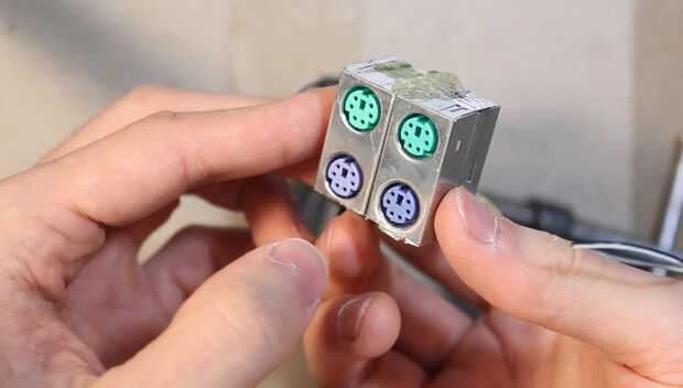 Empujar una pieza de perfboard a través de los pines de la parte inferior de los puertos PS/2 para hacer la soldadura más fácil.