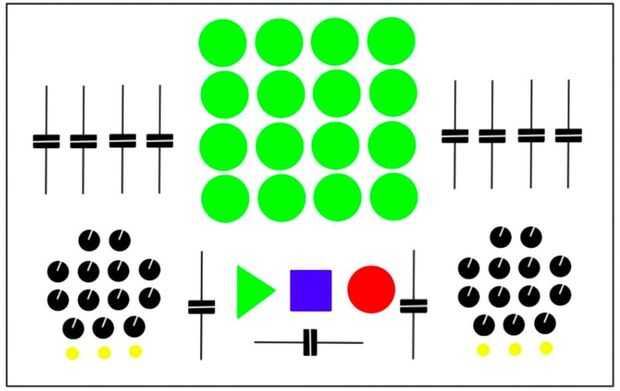 Luego vinieron los controles analógicos. Análogo en este sentido significa algo que un voltaje valor específico como un deslizador, potenciómetro rotativo de salida o fuerza resistencia sensible. Es importante señalar aquí que los potenciómetros con valores entre 10k y 100 k funcionan mejor con el BrainWith mi tienda compró controladores que siempre he encontrado que carecían incluso sólo un sliders extra 2 o 3 así que decidí jugar seguro y van para 11, uno de ellos es un crossfader dedicado. Quería recrear el aspecto de los racks de efectos utilizo más en Ableton en mi controlador de modo de Potenciómetros rotativos decidió incluir dos lotes de 8 en configuración 4 x 2, dos lotes de 3 canal EQ y 4 extra sólo en caso. Hice un diseño crudo en Sketchbook express que se puede ver en las imágenes para obtener una idea aproximada de cómo diseño los controles y para averiguar si tenía suficientes controles para su propósito.