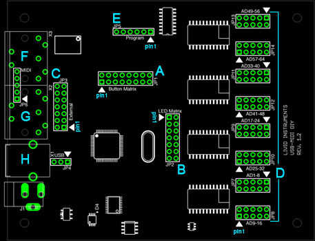 Para agregar el desplegable resistencias, debe conectarse un resistor entre 30k y 39 k a un pin de 'matriz de botón'. El otro lado debe entonces conectarse el conector de tierra externo encabezados, el primer pin de la cabecera de' externo' indicada por una flecha. Cada botón pin de matriz utilizado necesita un pull-down resistor.