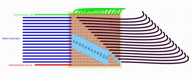 Para hacer el cableado fácil y menos sucio he decidido crear un mini circuito para conectarlo todos juntos para salvar a conectar 16 diferentes cables a uno de los pines. Uso de DIY Layout Creator para planificar mi circuito perfboard vino para arriba con la imagen de arriba. También debe ayudar a mostrar cómo todo está conectado para arriba.