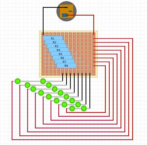 Agrupan los 16 LEDs en 8 grupos de 2, conectando el ánodo (positivo/largo pierna) a una resistencia de 270 ohmios, entonces el otro extremo de la resistencia a la zapata del positivo de energía de 12v de una fuente de entrada. El cátodo (negativo corto pierna) del LED se conecta al ánodo del LED otra con su cátodo a la terminal negativa de la entrada de alimentación. Repetí este proceso para cada uno de los LEDs restantes. Una vez más hice cosas más fácil haciendo un circuito perfboard para todo como se muestra en la imagen de arriba.