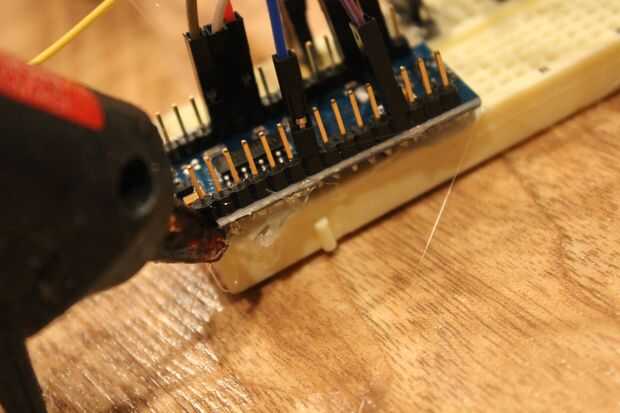 Pegamento caliente es impresionante. Permite conectar entre sí dos cosas, pero todavía tienen la opción de tomar aparte. Puesto que el vínculo es tan fuerte hace un gran adhesivo para cualquier proyecto, y puede fácilmente ser sacado con un cuchillo. Por esta razón decidí montar el tablero y el arduino con el adhesivo caliente en lugar de tornillos. Sin dejar de mencionar lo fácil que es pegamento caliente algo.