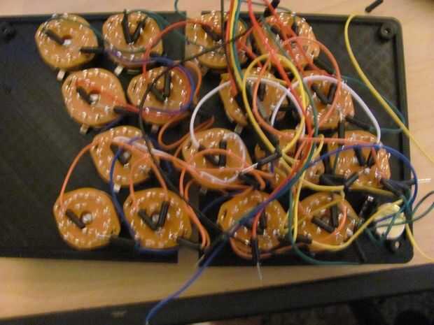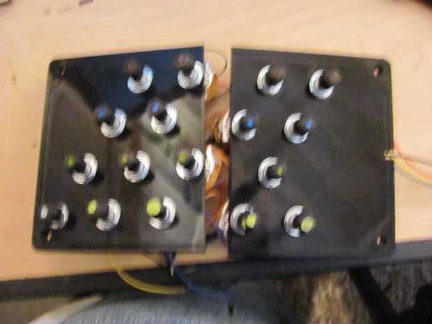Ahora es el momento de montar la tapa. Las columnas están dispuestas a lo largo de la longitud de la caja y las filas a lo largo de la otra dirección. El potenciómetro de 10 k va en la esquina inferior derecha. Puede utilizar los alicates para apretar la tuerca de abajo encima de la caja, asegúrese de que los interruptores están en el orden correcto va tanto vertical como horizontalmente, de lo contrario el dispositivo no funcionará muy bien.