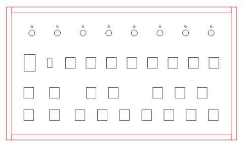 El panel superior de la caja de cigarro tiene 8 potenciómetros, 24 botones, un interruptor y un LED indicador de actividad: