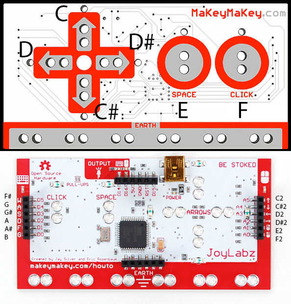Makey makey es un microcontrolador que actúa como un teclado cuando está conectado al ordenador. Había reprogramado para que envíe notas midi. ¿Por qué? Porque al utilizar un teclado para control de cosas la ventana que está controlando tiene que ser activo todo el tiempo. Con midi se pueden controlar al mismo tiempo varios programas o sintetizadores. Y es ampliamente apoyada.