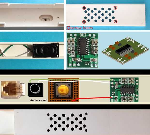 En este paso la toma de audio, el altavoz y el amplificador se colocan en el conducto menor. La toma se coloca entre el conector RJ-11 y el botón de pulgar, la placa del amplificador se coloca en el otro lado del botón de pulgar, el altavoz en el extremo del conducto.