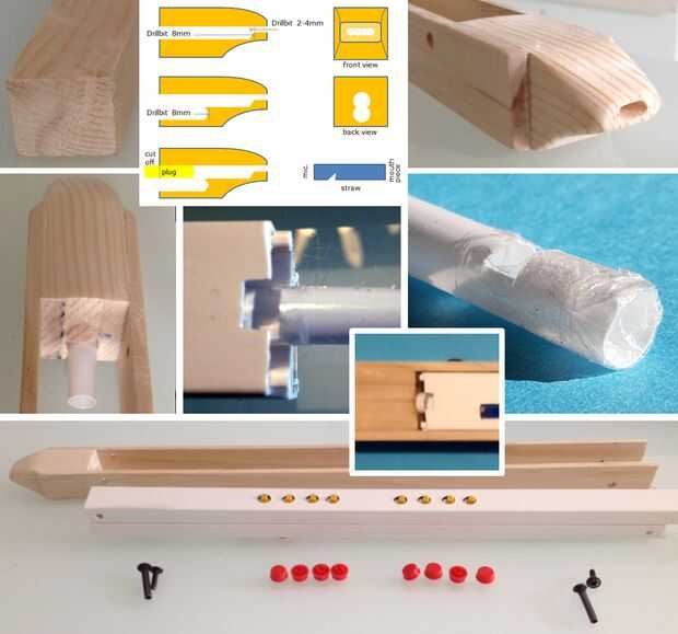 El esquema muestra cómo forma de la pieza de la boca y donde perforado los agujeros para el canal de aire. El diámetro de los agujeros en el lado de boca son 2-4mm y se presentan a un óvalo bueno apertura. En la parte posterior dos agujeros son necesarios: un agujero en la parte inferior que sale del micrófono (a través de una paja insertada) y un agujero en el medio que conecta la boca la puerta de la paja. El final del agujero central está conectado por lo que todo el aire existen a través de la pajilla en el orificio inferior. El diámetro de los orificios en el extremo posterior depende del diámetro de la paja que se utiliza, que en mi caso fue de 10mm. Este diámetro también depende el flujo de aire que se siente y por supuesto qué tipo de paja puede obtener/comprar.