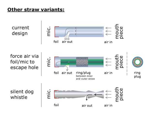 He probado algunas variaciones en el diseño de la paja, ver segunda foto. Esperaba el segundo diseño de doble paja para ser más eficaz desde que las fuerzas de la corriente de aire para pasar más por el micrófono. También esperaba la dogwhistle para ser más eficaz ya que produce el sonido (inaudible pero sonido nonethteless). Por más efectivas me refiero a que los valores de los sensores deben ser más estable y fácil de manipular (graduately) con la respiración.