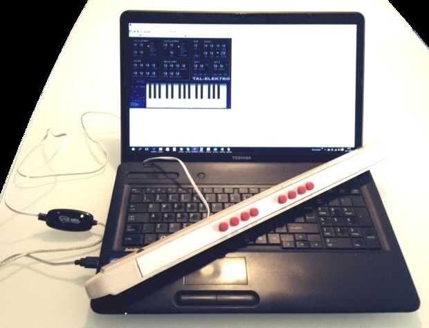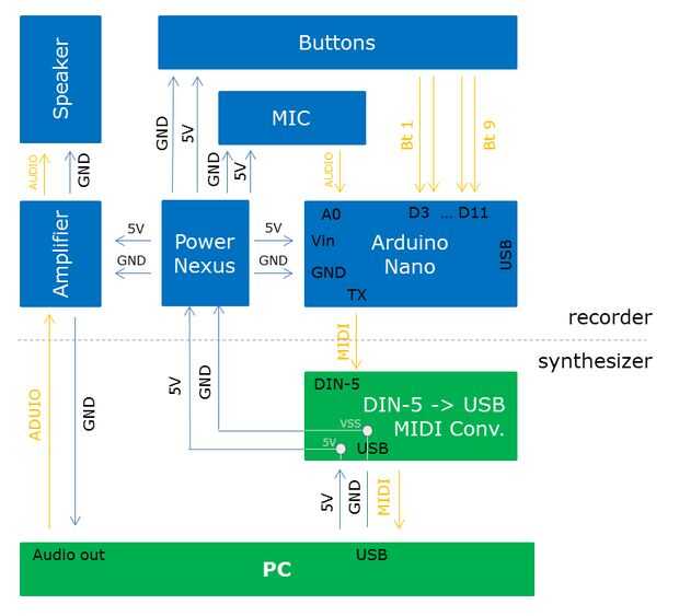 - Controlador de MIDI Recorder: Detecta la presiona de dedo (con 9 teclas) y flujo de aire/de la respiración (con un micrófono que registra nivel de audio) y convierte este usuario entrada serial midi (con un Arduino). También salidas de audio recibido desde el pc (amplificador y altavoces). La segunda imagen muestra cómo al final resulta miradas, los siguientes pasos con más detalle cómo hacer que los componentes.