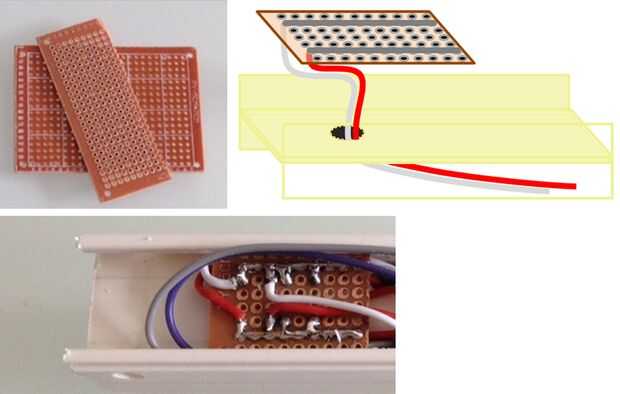 La platina debe colocarse al principio del conducto superior. Los cables flexibles que terminan en el conducto menor. Para esto puede perforar un agujero a través de dos conductos. (Sin embargo utilicé las ranuras para los pines de Arduino en el paso siguiente.)