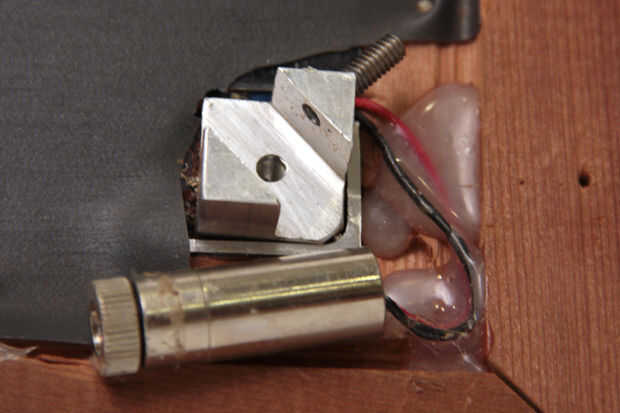 Observe cómo he utilizado pegamento caliente para estabilizar los hilos que salen del láser; Aprendí la forma que las conexiones entre los cables y el láser de pcb son muy débiles y pueden fácilmente se rompen si accidentalmente tira sobre los cables. Es una buena idea utilizar el pegamento caliente como un búfer entre el láser y cualquier tira puede ocurrir por accidente en el otro lado de la caja.