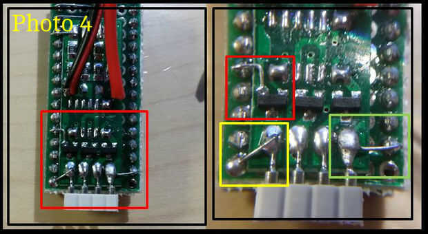 - La otra parte dura. Ver foto 4 o esta costumbre tiene mucho sentido. La soldadura de la almohadilla de la salida a la izquierda a la fila extra, caja amarilla. La soldadura de la pata izquierda de la izquierda mosfet con el conector de tierra de arduino, caja roja. Y después de la soldadura de la almohadilla derecha salida el pin Vin en el arduino, caja verde.