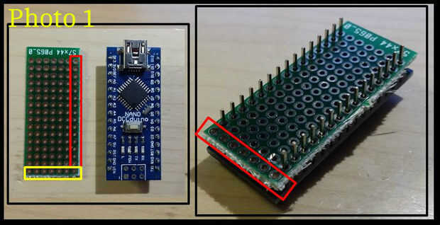 - El PCB se debe cortar para que tenga una fila extra de agujeros de lo que se necesita para el arduino, Foto 1.