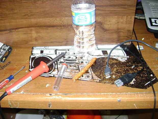 Casi todo lo que necesitas es etiquetada en la foto. También necesitarás: Tijeras o cuchilla Pistola de pegamento caliente Alicates o un martillo Cinta aislante y un destornillador de aguja (hoja de afeitar funcionará)